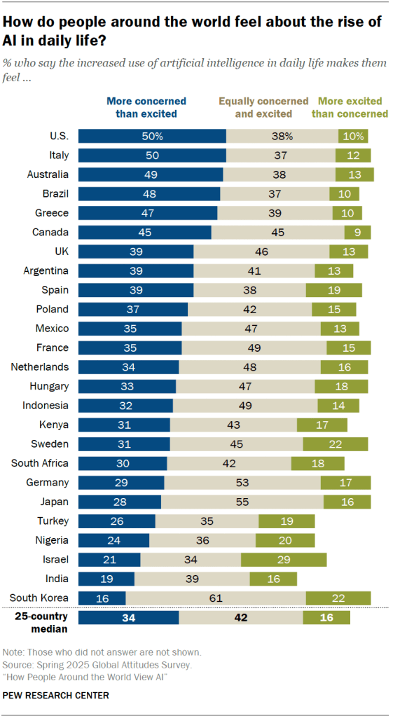 Pesquisa global do Pew Research Center, denominada How People Around the World View AI, revela a percepção dos riscos da IA: as pessoas estão mais preocupadas do que entusiasmadas com o avanço da inteligência artificial. A pesquisa foi realizada em 35 países entre 8 de janeiro e 26 de abril de 2025, abrangendo 28.333 adultos.